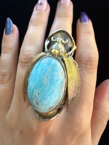 Artisanal Scarab Beetle Larimar Gemstone Ring